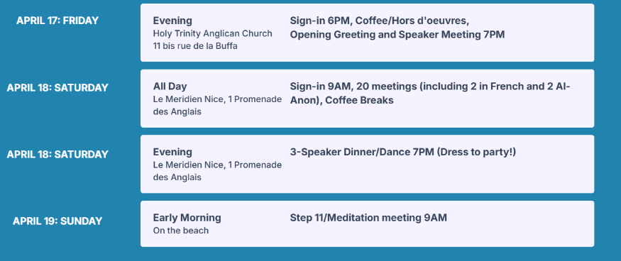 Welcome to Nice, the jewel of the French Riviera – a place where serenity meets fellowship. With its sun-kissed coastline, the gentle rhythm of the Mediterranean, and the charm of its historic streets, Nice offers the perfect setting for reflection, connection, and hope. Here, surrounded by the beauty of the Promenade des Anglais and the vibrant energy of Vieux Nice, we come together in unity, sharing our stories, strength, and courage – one day at a time. Join us in this peaceful haven by the sea, where recovery meets renewal under the bright Mediterranean sky.