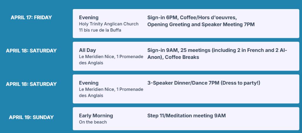 Welcome to Nice, the jewel of the French Riviera – a place where serenity meets fellowship. With its sun-kissed coastline, the gentle rhythm of the Mediterranean, and the charm of its historic streets, Nice offers the perfect setting for reflection, connection, and hope. Here, surrounded by the beauty of the Promenade des Anglais and the vibrant energy of Vieux Nice, we come together in unity, sharing our stories, strength, and courage – one day at a time. Join us in this peaceful haven by the sea, where recovery meets renewal under the bright Mediterranean sky.